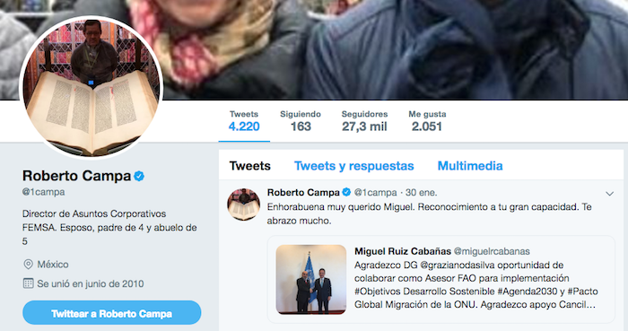 Ciudad de México, 17 de febrero (SinEmbargo).- El ex Secretario de Trabajo y Previsión Social, Roberto Campa Cifrián, es el nuevo Director de Asuntos Corporativos de la empresa Fomento Económico Mexicano S.A.B. de C.V. (FEMSA).