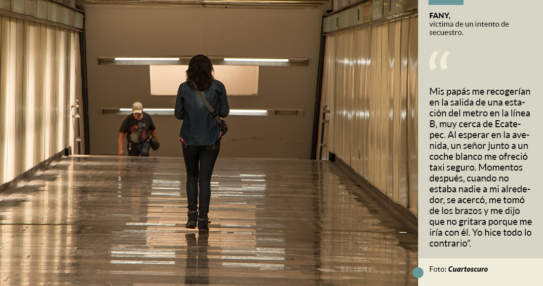 El 2 de febrero de 2018 regresé a mi casa a las 10 de la noche. Mis papás me recogerían en la salida de una estación del metro en la línea B, muy cerca de Ecatepec. Al esperar en la avenida, un señor junto a un coche blanco me ofreció taxi seguro. Momentos después, cuando no estaba nadie a mi alrededor, se acercó, me tomó de los brazos y me dijo que no gritara porque me iría con él. Yo hice todo lo contrario. Empecé a gritar, a llorar y a pedir auxilio.
