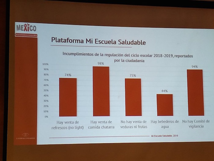 Un monitoreo elaborado por las organizaciones El Poder del Consumidor y la Red por los Derechos de la Infancia en México (Redim) detectó la presencia de refrescos en escuelas en el 74 por ciento de los casos; venta de comida chatarra en el 98 por ciento y el 75 por ciento aún no cuenta con oferta suficiente de fruta ni verdura.