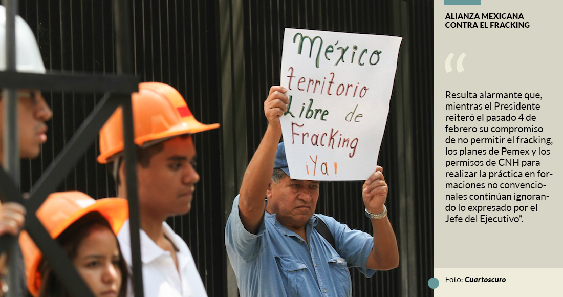 En 2014, diputados de los partidos de la Revolución Democrática, del Trabajo, Movimiento Ciudadano y Nueva Alianza presentaron una iniciativa de Ley General para la Prohibición de la Fractura Hidráulica en la exploración y explotación de hidrocarburos, que terminó engavetada. Desde entonces se han elaborado otras tres iniciativas, que también terminaron archivadas.