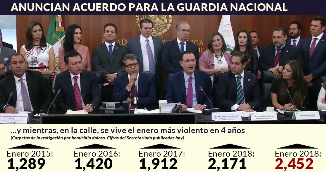 Previo a la sesión ordinaria del Senado, los coordinadores de las bancadas de PRI, PAN, PRD y Movimiento Ciudadano ofrecieron una conferencia de prensa donde destacaron el acuerdo alcanzado entre los grupos parlamentarios para el proyecto de la Guardia Nacional.