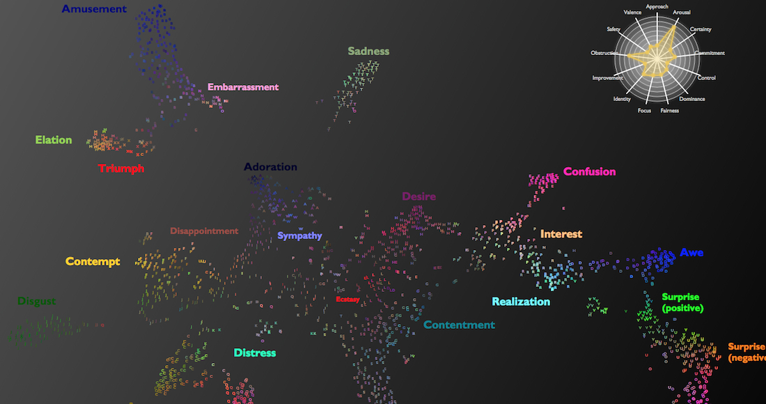 Colocaron los sonidos y el análisis emocional en un diagrama de dispersión interactivo, donde cada punto emocional del mapa se divide en sus partes, según la forma en que las personas interpretan el sonido. Por ejemplo, cerca del centro del "éxtasis" es 33 por ciento de éxtasis, 33 por ciento de alivio, 8 por ciento de satisfacción, 8 por ciento de decepción, 8 por ciento de disgusto y 8 por ciento de angustia.