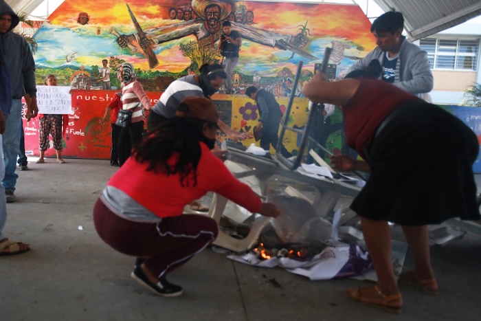 Ahora, en la cabecera del municipio de Temoac, fundado por el luchador social Vinh Flores, tío de Samir que enfrentó al Gobierno de Díaz Ordaz y también fue asesinado, mujeres arrebatan las boletas de quienes están en la mesa y las lanzan donde los hombres ya prendieron fuego.