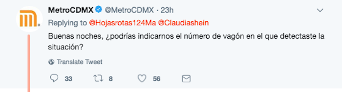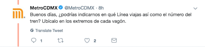 La cuenta oficial del Metro solicito el número de vagón y el usuario respondió que lo desconocía, pero calculó que iban a bordo alrededor de 20 personas.
