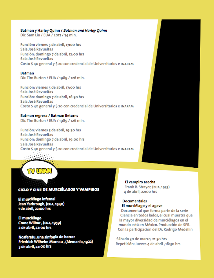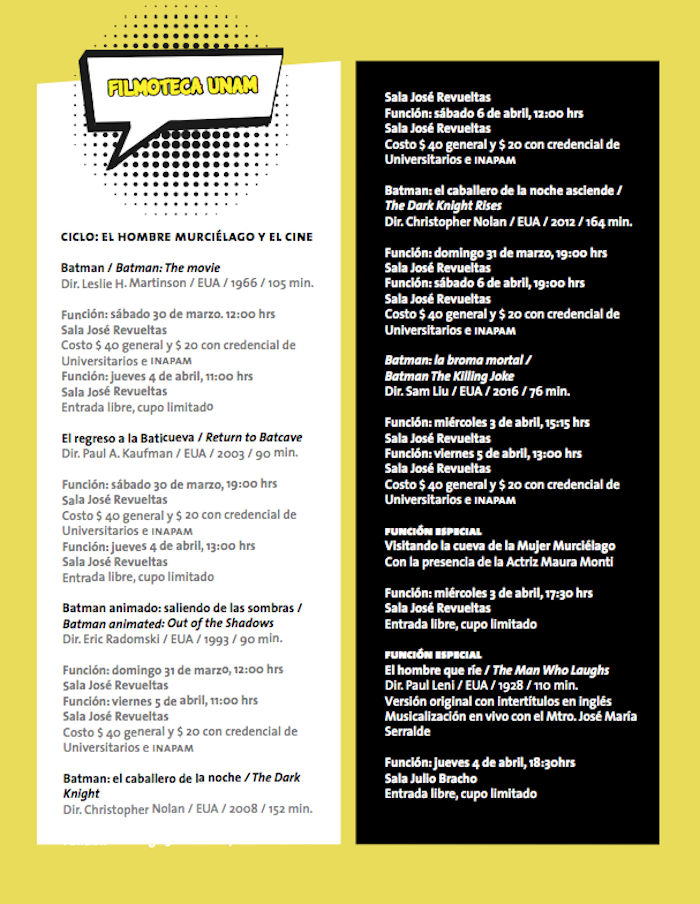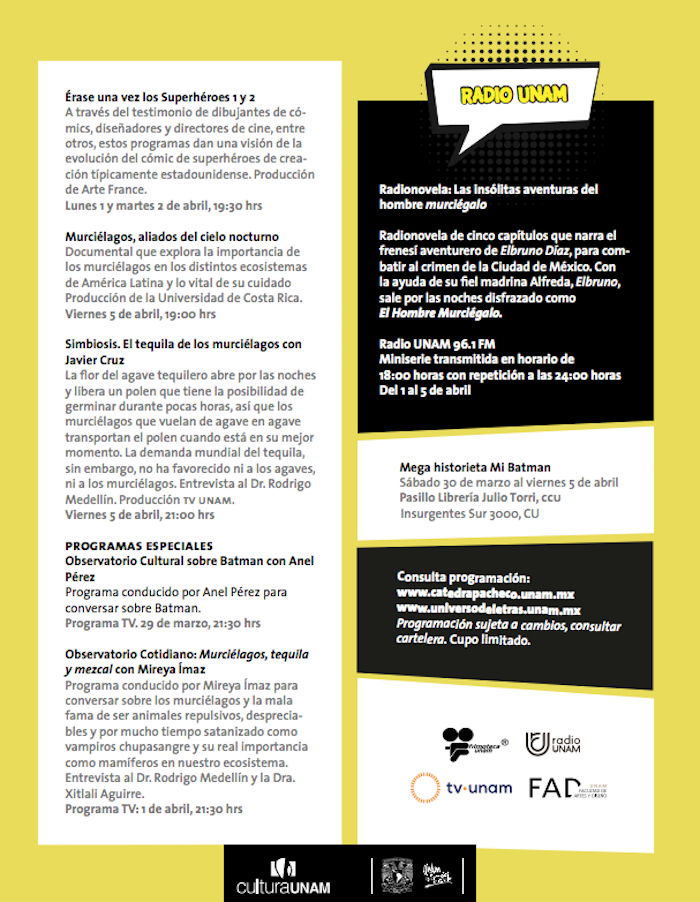 A partir del 30 de marzo hasta el 5 de abril se llevarán a cabo distintas actividades como mesas de diálogo para reflexionar sobre el mítico superhéroe, se proyectarán películas durante el ciclo "El hombre murciélago en el cine" y se retransmitirán las famosas radionovelas de Batman, entre otras.