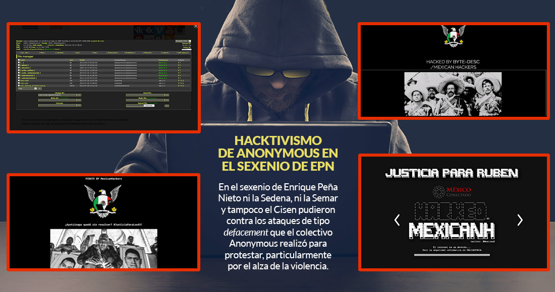 Ciudad de México, 5 de marzo (SinEmbargo).– Durante el sexenio del ex Presidente Enrique Peña Nieto, grupos de hacktivistas mantuvieron una intensa ofensiva dirigida a portales gubernamentales. A través de varios mensajes, los piratas cibernéticos dejaron en claro que los fines de sus actividades que iban más allá de sólo demostrar su capacidad para violentar la seguridad de sitios oficiales y destacaron sus protestas por la desaparición forzada de los 43 estudiantes de Ayotzinapa, en Iguala, Guerrero; el asesinato del fotoperiodista Rubén Espinosa Becerril y el aumento de los feminicidios en todo el país.
