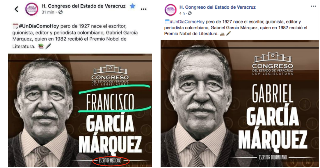 Tras darse cuenta del error, el encargado de las redes sociales del Congreso veracruzano reemplazó la imagen por otra en la que sí aparecía el nombre de Gabriel García Márquez, además de corregir el error de su nacionalidad.