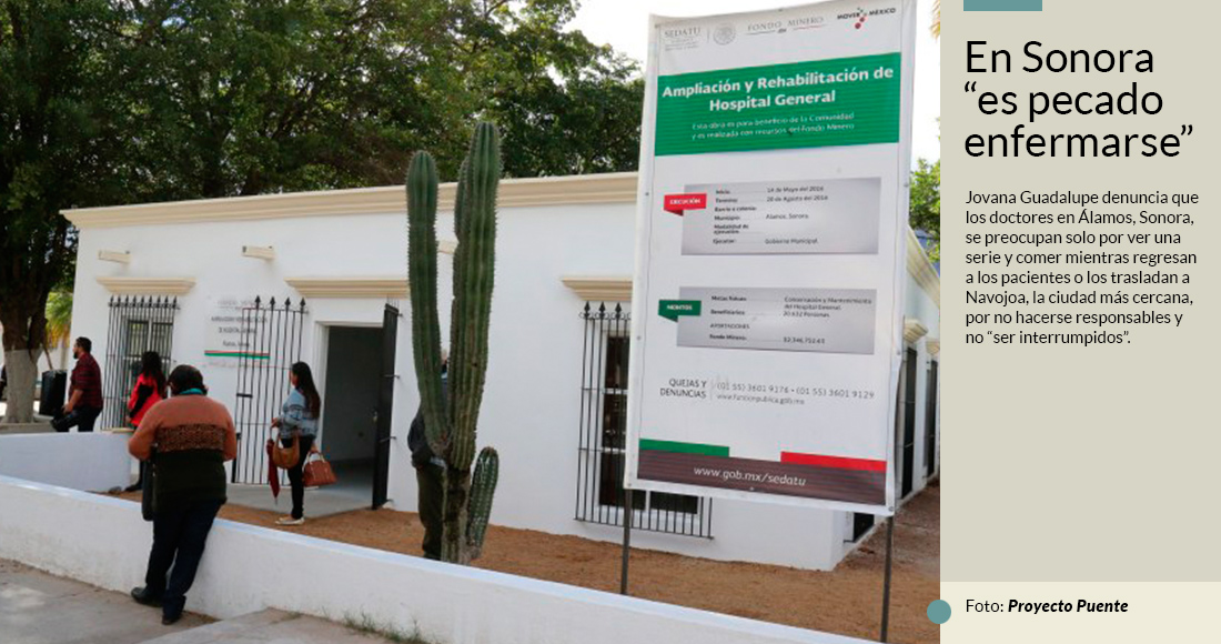 La afectada asegura que los doctores en Álamos se preocupan solo por ver una serie y comer mientras regresan a los pacientes o los trasladan a Navojoa, la ciudad más cercana, por no hacerse responsables y no “ser interrumpidos”.