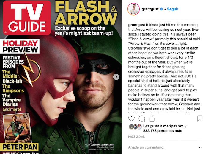 El actor Grant Gustin publicó este texto junto a una imagen de la portada de TV Guide, en la que aparece con Amell, ambos en sus respectivos trajes de superhéroes.