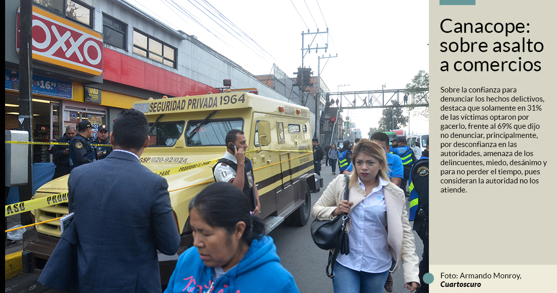 Ada Irma Cruz, presidenta de la Cámara de Comercio, Servicios y Turismo en Pequeño (Canacope), en la Ciudad de México, denunció en una conferencia de prensa que 9 de cada 10 negocios en la entidad han sido afectados por la delincuencia, de acuerdo con un sondeo de opinión sobre la percepción de seguridad e incidencia de delitos en el sector micro, pequeña y mediana empresa de la CDMX, correspondiente a 2018.