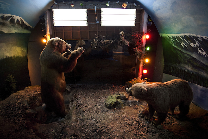 Por otro lado, la segunda parte del ensayo fotográfico se compone de un conjunto de fotografías de los dioramas y del montaje de estos. En esta sección apreciamos paisajes y atmósferas enrarecidas, un realismo extraño que, a pesar de estar apegado a las características de los ecosistemas que retrata, no deja de resultar extremadamente artificial, kitsch incluso. Una jirafa y una tríada de leones suntuosos con una montaña nevada de fondo; un par de tigres listos para atacar; un oso rugiente sobre sus patas traseras; un cocodrilo enseñando las fauces en medio de una jungla azulada; leopardos, pingüinos, aves, roedores en hábitats cuya construcción meticulosa evidencia su artificialidad.