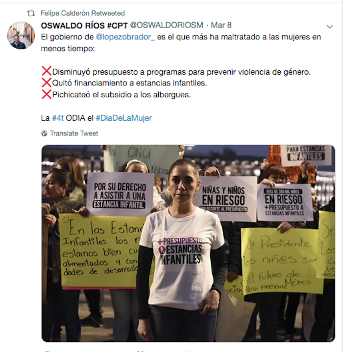 El retiro de fondos federales a las estancias infantiles ha sido uno de los temas que en las últimas semanas ha sido objeto del interés de Calderón, y lo ha manifestado a través del retuit a quienes se oponen a esta disposicióncon la etiqueta #estanciasinfantiless. El martes pasado su apoyo se centró en el perfil del intelectual mexicano Enrique Krauze –envuelto en el caso de las estrategias que habrían sido subsidiadas por él y un grupo de empresarios para contener el avance de AMLO durante el pasado periodo electoral–; a través de la etiqueta #NoMásLinchamientos su cuenta de Twitter ha sido una de las más contundentes entre las que protestan en contra de que se relacione al también historiador con estas prácticas.