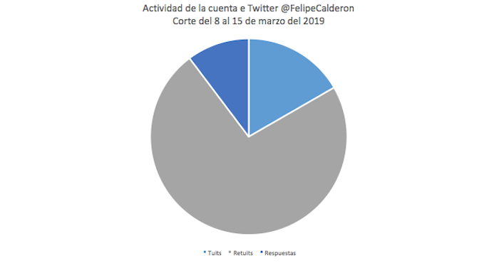 Felipe Calderón genera actividad en esta red social casi todos los días. Acumula más de 5 millones 400 mil seguidores y de acuerdo con la herramienta Social Blade, suma a esta cifra 290 simpatizantes por día. Entre el 8 y el 15 de marzo, Felipe Calderón generó 234 acciones entre tuits, retuits y respuestas, de las cuales el 73 por ciento fueron retuits.