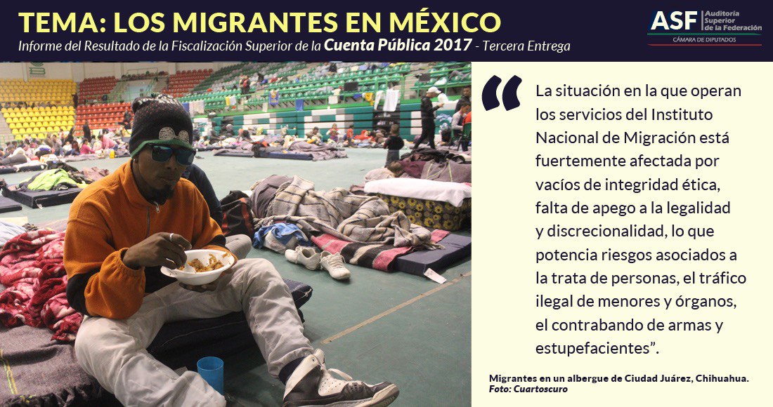 De acuerdo con el informe de la Cuenta Pública 2017 de la Auditoría Superior de la Federación (ASF), el Instituto Nacional de Migración (INM) presentó carencias de procedimientos y sistemas de control interno que le permitan garantizar la protección efectiva de los derechos de las personas que transitan por el territorio nacional, lo que potencia riesgos asociados a la trata de personas, el tráfico ilegal de menores y órganos, el contrabando de armas y estupefacientes, como ocurrió durante la entrada de la Caravana de migrantes centroamericanos.