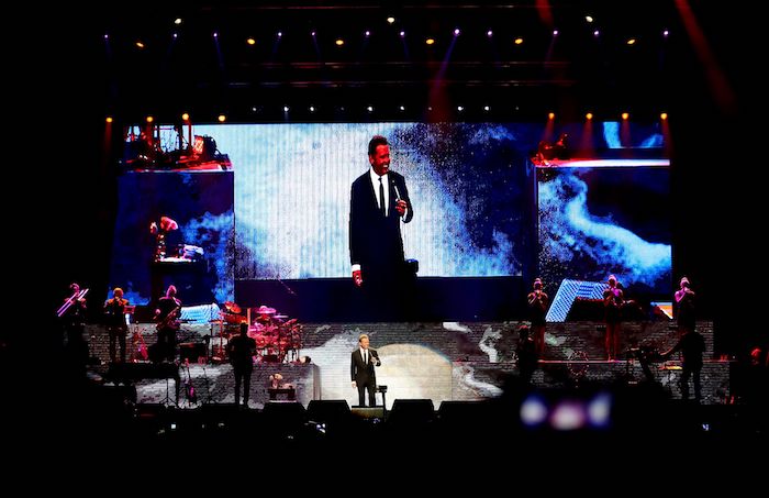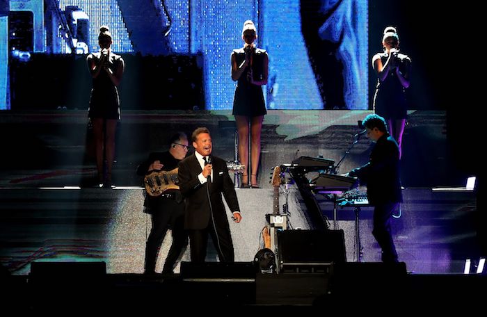Luis Miguel, quien vistió su característico traje negro con camisa blanca y corbata, se apoderó del escenario con sutiles movimientos de cadera e invitaciones a los asistentes para que cantaran con energía.
