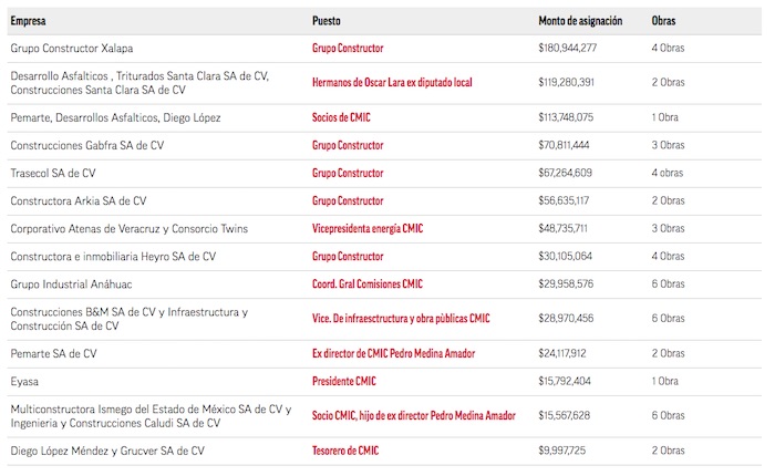 De este grupo, diez empresas constructoras pertenecen a empresarios que integran el primer círculo de poder de la CMIC. En conjunto, recibieron 311 millones de pesos en asignaciones, 90 por ciento de las cuales fueron por vía de adjudicación directa. Los otros 500 millones de pesos fueron repartidos bajo el mismo esquema de adjudicación directa entre otros cinco grupos constructores.
