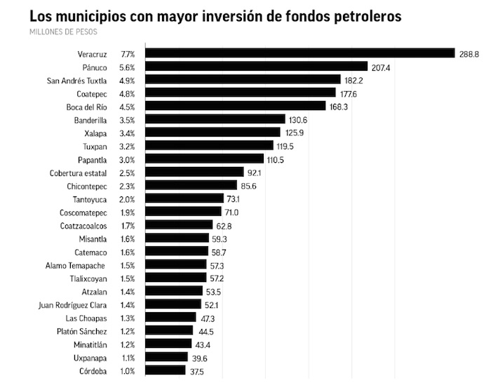 Veracruz es claro ejemplo de esto. Mientras los bastiones electorales del PAN, partido del ex Gobernador Miguel Ángel Yunes Linares, recibieron obras por casi 500 millones de pesos, otros tradicionalmente petroleros como Tihuatlán, Coatzintla, y Pánuco, suman apenas 157 millones de pesos en inversión.