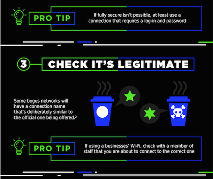 No deberías usar jamás una red extraña a menos que puedas verificar su origen. En aeropuertos o estaciones es aconsejable encontrar una cafetería o bar que tenga su propio servicio de Wi-Fi. Además, es buena señal si el proveedor le hace marcar una casilla con los Términos y condiciones, ya que es un indicio de legitimidad. Por supuesto, debes leerlos.