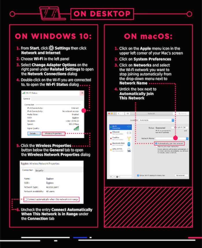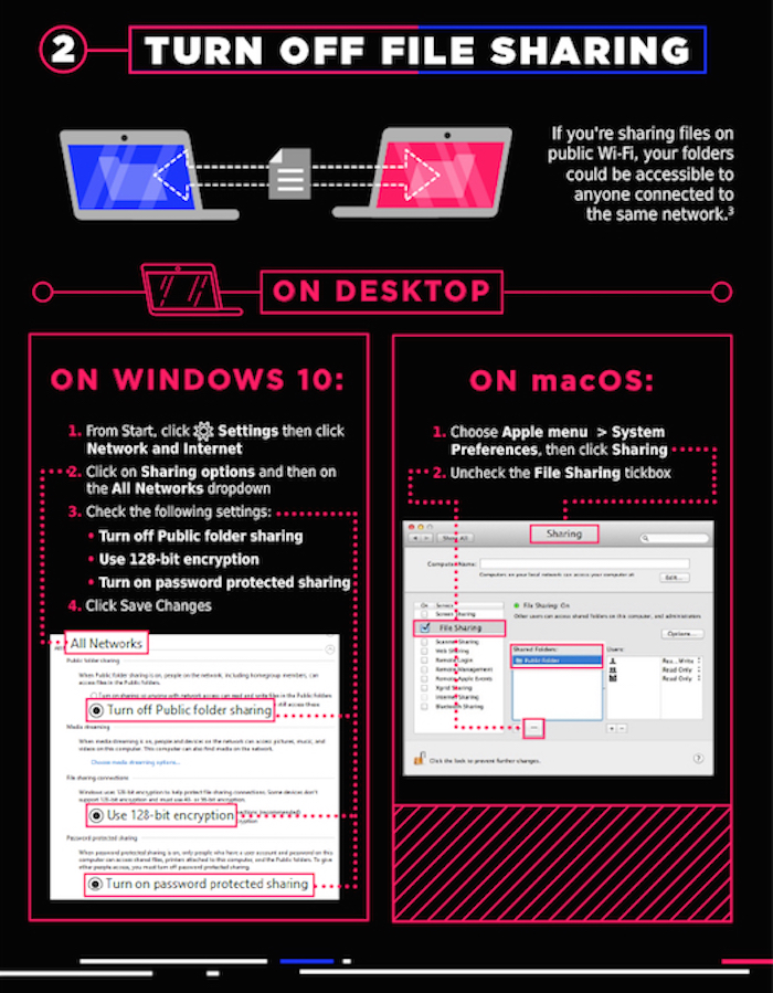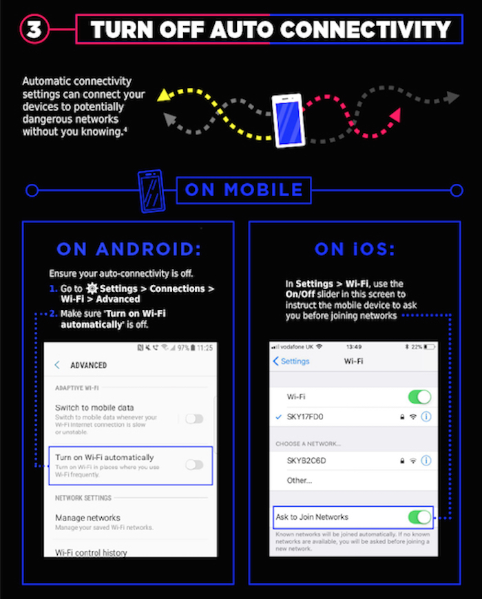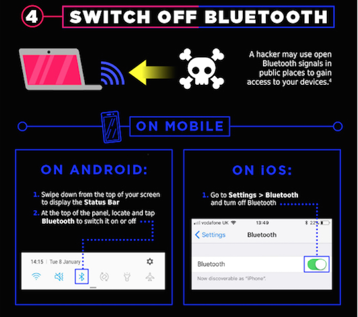 Las siguientes infografías sintetizan algunas de las propuestas a considerar para blindar tu smartphone, tableta o PC ante las redes públicas. Tener una actitud vigilante, abandonar la configuración predeterminada por la personalizada, despedirte transitoriamente del bluetooth o apagar el intercambio de archivos son algunas de las claves fundamentales.