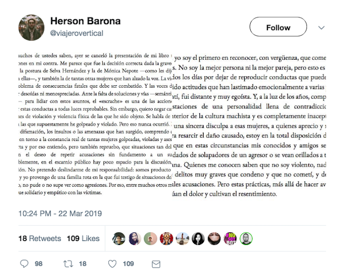 A través de Twitter, diversas mujeres realizaron las primeras denuncias el 21 de marzo, en específico en contra del escritor Herson Barona, a quien acusaron de "haber golpeado, manipulado, embarazado y abandonado a más de 10 mujeres".