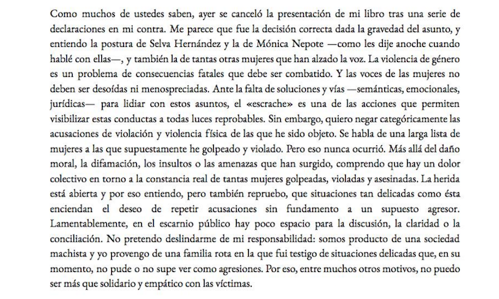 Ante la ola de críticas, Barona compartió un comunicado en su cuenta de Twitter en el que se deslindaba de las acusaciones en su contra y aseguró que estas son un “síntoma colectivo”.