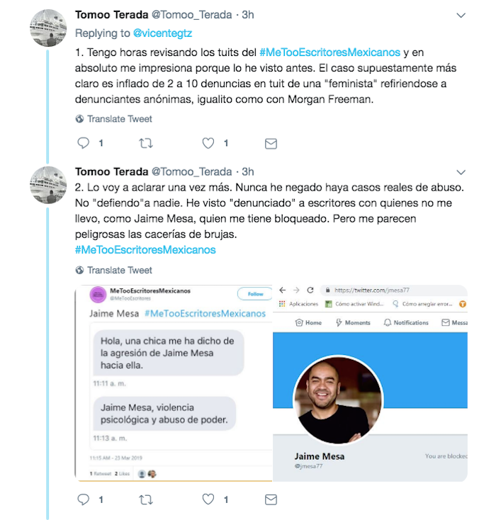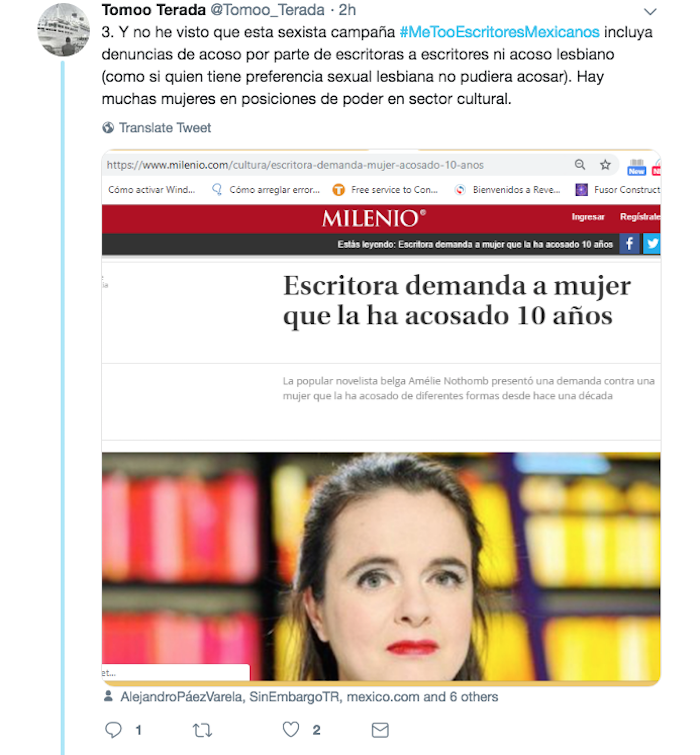 “Y no he visto que esta sexista campaña #MeTooEscritoresMexicanos incluya denuncias de acoso por parte de escritoras a escritores ni acoso lesbiano (como si quien tiene preferencia sexual lesbiana no pudiera acosar)”, comentó.