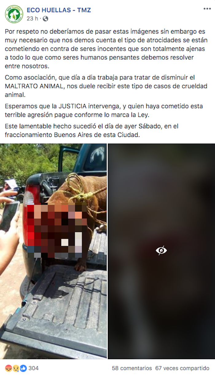 Refieren que como asociación, que día a día trabaja para tratar de disminuir el maltrato animal, "nos duele recibir este tipo de casos de crueldad animal, esperamos que la justicia intervenga, y quien haya cometido esta terrible agresión pague conforme lo marca la ley".