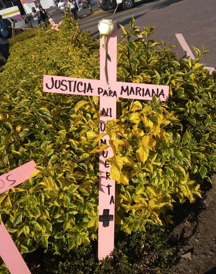 También colocó decenas de cruces rosas en las jardineras del memorial con frases como “No más feminicidios”, “Justicia para Mariana”, “Alerta de género”, “Ni una más”. Irinea ha realizado este tipo de manifestaciones durante casi nueve años.