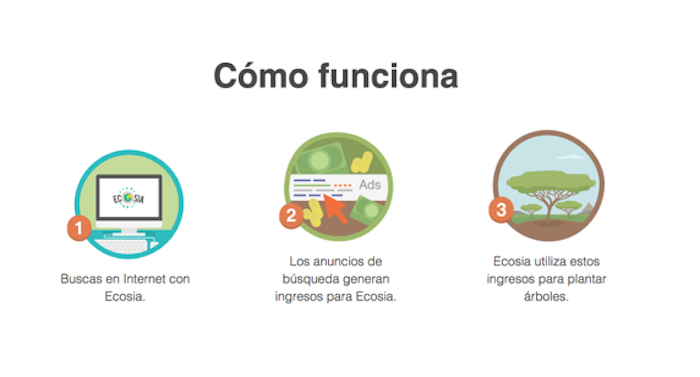 Su funcionamiento es sencillo, ya que cada clic es útil para cuidar nuestro planeta y liberar oxígeno a la atmósfera, compensando la huella de CO2 producida por las numerosas emisiones. Ecosia muestra anuncios online mediante Bing, obteniendo ingresos por cada búsqueda y cada clic de los usuarios. De hecho, el buscador financia la siembra de árboles cada 11 segundos.