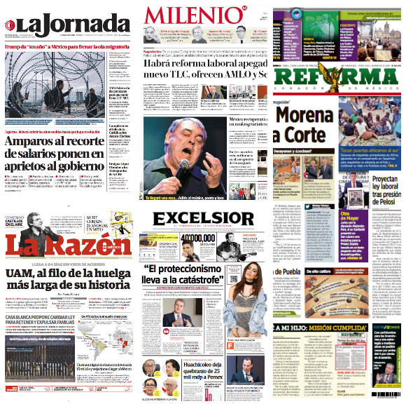 En La Jornada: AMLO descarta dar pretextos para que no se firme el T-MEC. México no pretende dar pretextos para que Estados Unidos o Canadá puedan argumentar la necesidad de reabrir las negociaciones sobre el nuevo tratado comercial. Por ello, el presidente Andrés Manuel López Obrador confió en que la iniciativa de reforma laboral enviada al Congreso se apruebe en sus términos, porque se apega a los compromisos contraídos por el país.