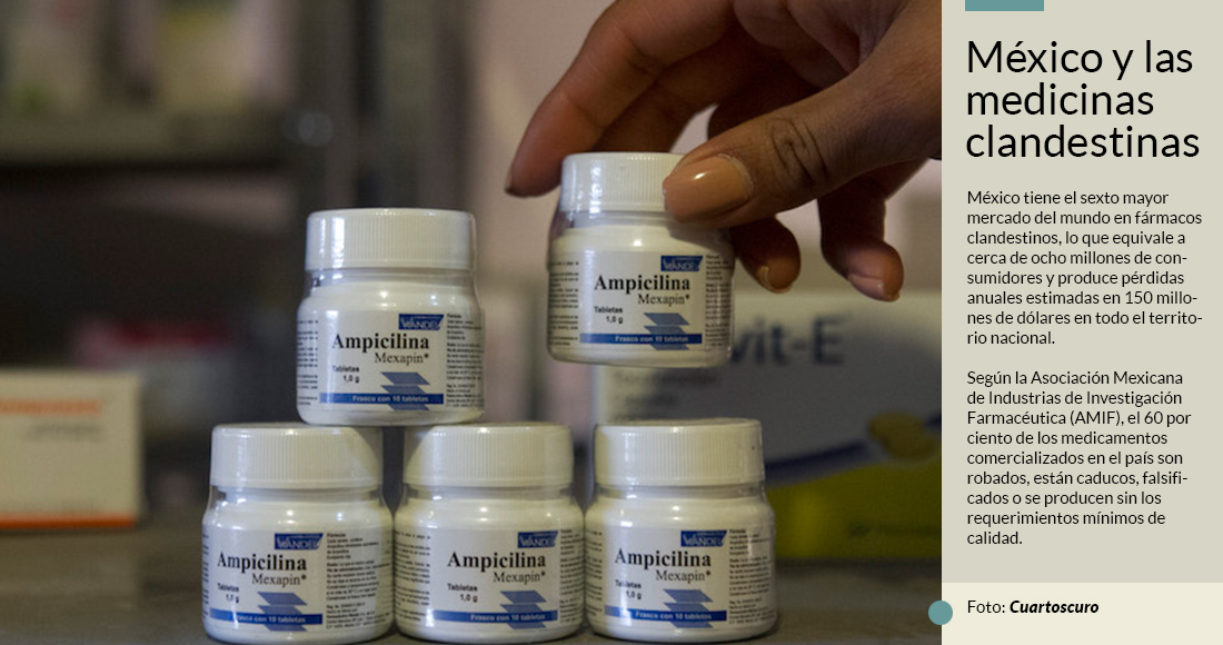 Según la Asociación Mexicana de Industrias de Investigación Farmacéutica (AMIF), el 60 por ciento de los medicamentos comercializados en el país son robados, están caducos, falsificados o se producen sin los requerimientos mínimos de calidad.