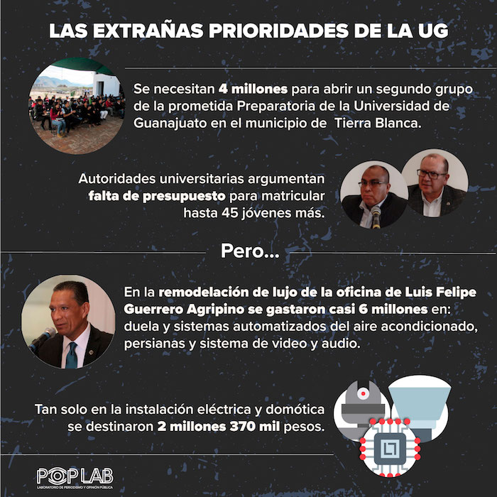 Luego del gasto en la oficina “inteligente” del rector general, entre los años 2016 y 2018 la UG gastó 1 millón 941 mil pesos en la remodelación de una vivienda ubicada en el callejón del Boliche, en el centro de la ciudad capital, para adaptarla como una sala de juntas, con el argumento de la falta de espacios en el edificio central. A pesar de la promesa de un plan de austeridad en 2017, la vivienda fue habilitada con una recepción, sala de espera, sala de juntas y baño con cocina, en la que se agregaron aire acondicionado, y acabados de madera y cantera.