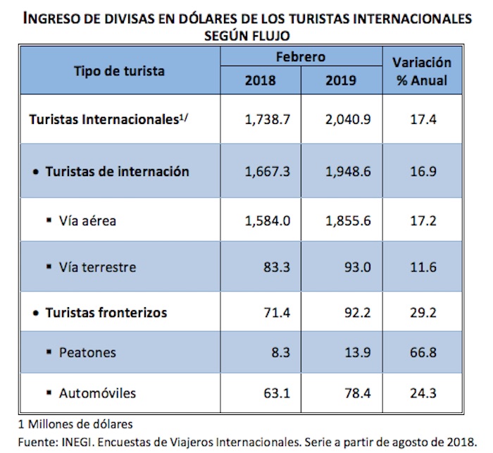 También se registró un incremento del ingreso de divisas en los turistas fronterizos: 92.2 millones de dólares, 29.2 por ciento mas que en febrero de 2018.