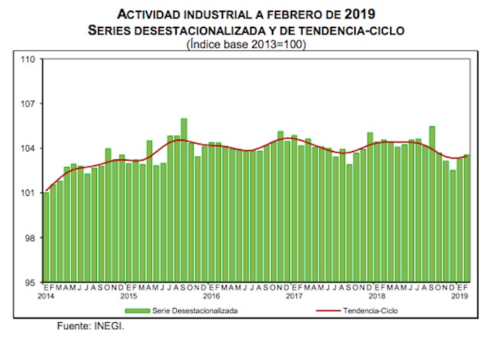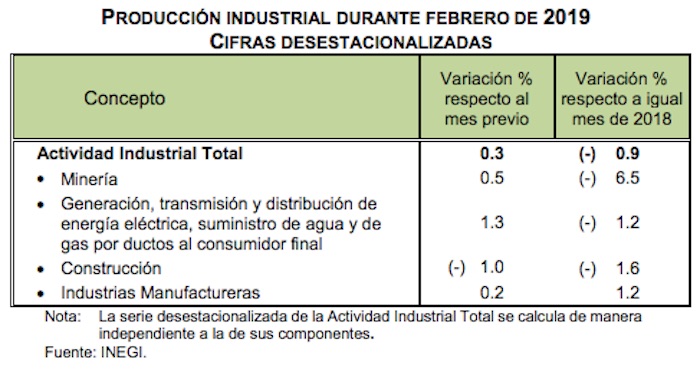 Ciudad de México, 11 de abril (Economía Hoy/SinEmbargo).- La producción industrial de México aumentó 0.3 por ciento en términos reales durante febrero de 2019 respecto a enero. En su comparación anual se redujo en 0.9 por ciento, y acumula cuatro meses a la baja, de acuerdo con cifras de Producción Industrial publicadas por el Instituto Nacional de Estadística y Geografía (Inegi) este jueves.