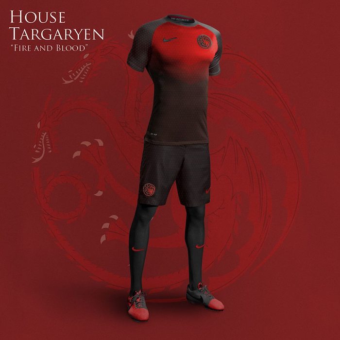 La Casa Targaryen, de la cual sobrevive Daenerys, fue en otro tiempo una de las más poderosas, empero, hoy casi no queda nada de ella. Su uniforme presenta un negro en el jersey con un contraste rojo en el pecho. Las medias y el pantaloncillo también muestran un elegante color negro.