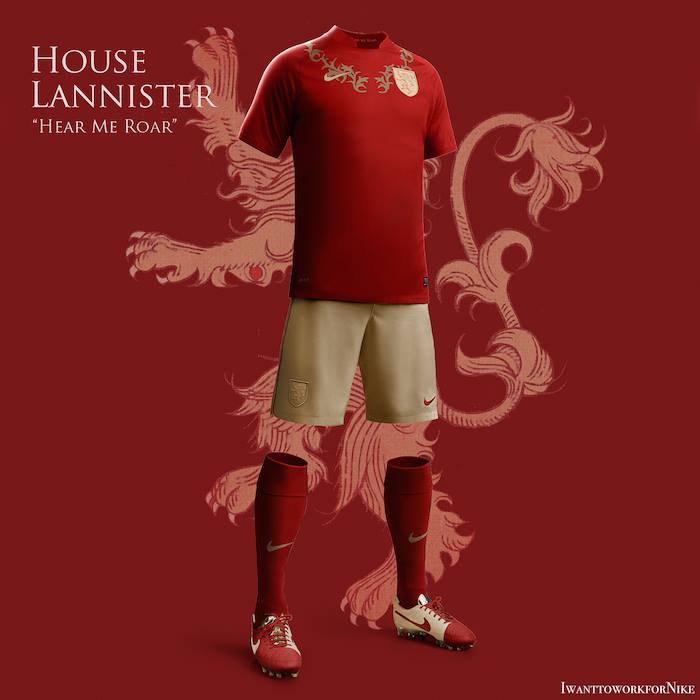 La casa Lannister, la más rica, se inspira en su lema “Hear me roar”. La casaca se muestra en un tono rojo y un león en su escudo, además del pantaloncillo en blanco y las medias al color del jersey.