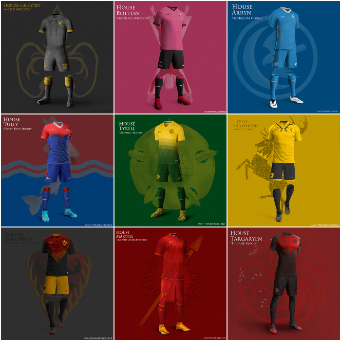 La Copa del Mundo de Game of Thrones: la diseñadora española Nerea Palacios se inspiró en la exitosa serie y desarrolló los uniformes que vestirían cada una de las Casas si fueran equipos de futbol soccer, cobijados por la reconocida marca deportiva Nike.