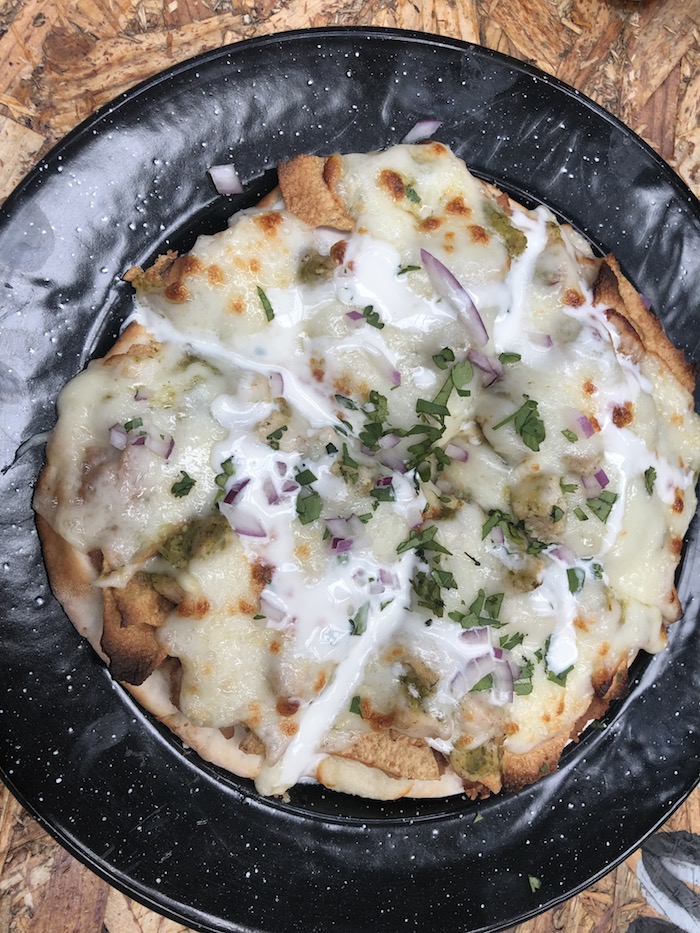 Nuestra recomendación es la pizza de chilaquiles que lleva una base de frijoles, queso mozzarella, chilaquiles verdes, pollo, cebolla y crema, sin duda te encantará.