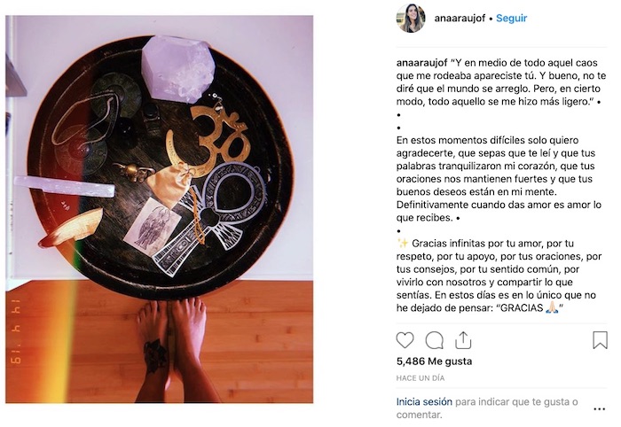 Araujo comienza su publicación, que acompaña con una fotografía en la que se aprecia un cuenco con vario símbolos y amuletos de diferentes creencias religiosas, indicando: "Y en medio de todo aquel caos que me rodeaba apareciste tú. Y bueno, no te diré que el mundo se arregló. Pero, en cierto modo, todo aquello se me hizo más ligero".
