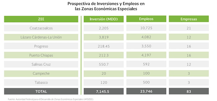 De acuerdo con el último informe de gobierno de Peña Nieto la prospectiva era que estas zonas atraerían inversiones por un total de 7,145.5 millones de dólares.
