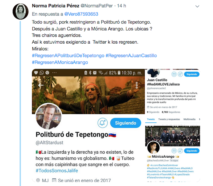 El grupo de seguidores que manifiesta su apoyo al Presidente Andrés Manuel López Obrador fue señalada por un estudio del Instituto Tecnológico y de Estudios Superiores de Occidente (ITESO) por participar en ataques a la prensa y recurrir a bots para posicionar tendencias. Sin embargo, la red ha crecido y nuevas cuentan adquirieron centralidad en las conversaciones, entre éstas la del usuario @AltStardust o Politburó de Tepetengo, que se caracterizó por sus críticas a opositores, hasta que este jueves en que fue suspendido de manera definitiva de Twitter.