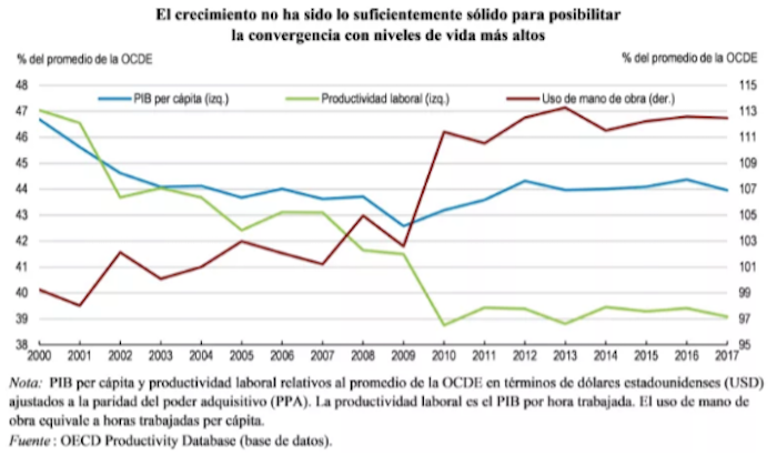 El problema está en la microeconomía. Los grandes indicadores económicos no se traducen en un mayor ingreso y una mejoría en los niveles de vida de la mayoría de los mexicanos. El PIB per capita de México es el más bajo de la OCDE y se explica sobre todo en que desde el año 2000 nuestra productividad ha venido a la baja (Ver gráfica).