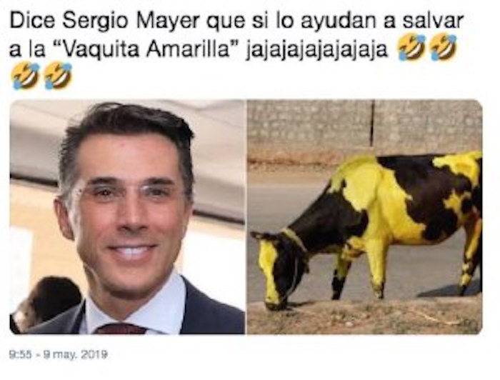 Ciudad de México, 10 de mayo (SinEmbargo).– El error de Sergio Mayer Bretón, Diputado federal por el Movimiento Regeneración Nacional (Morena), al hacer un llamado para salvar a la "vaquita amarilla" ha inspirado decenas de memes en las redes sociales.