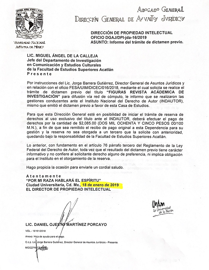 13.- Es falso que la revista Figuras se haya proyectado desde el inicio de la actual administración. El proyecto comenzó a desarrollarse en agosto de 2018 y en enero de 2019 fue notificada a esta Facultad la posibilidad de iniciar el trámite de reserva de título ante Indautor. Se anexa copia del oficio correspondiente.