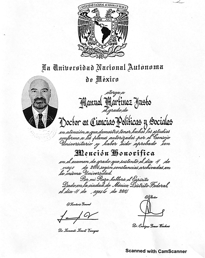 2.- En cuanto a la aseveración de que “[...] no cuenta con los títulos universitarios [...]”, anexo a la presente copia de los títulos de Licenciatura, Maestría y Doctorado.