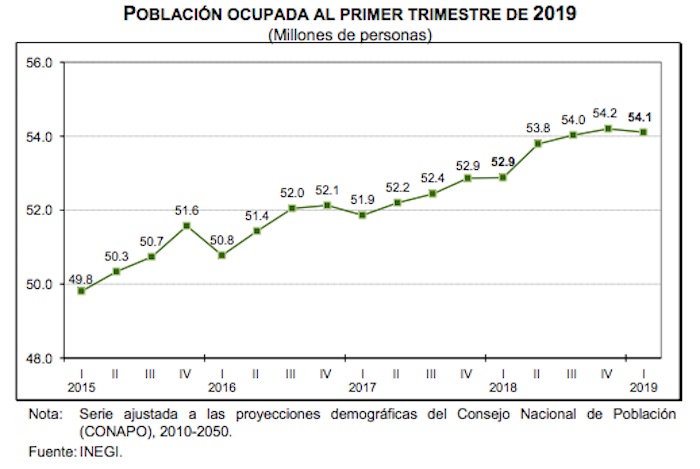 La población ocupada fue de 54.1 millones de personas, de las que 33.2 millones son hombres y 20.9 millones mujeres. Este dato fue superior en 1.3 millones al mismo periodo de 2018, pero la tasa de ocupación continúa con una tendencia al alza iniciada en 2016.