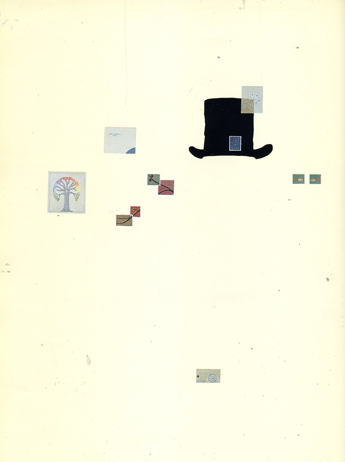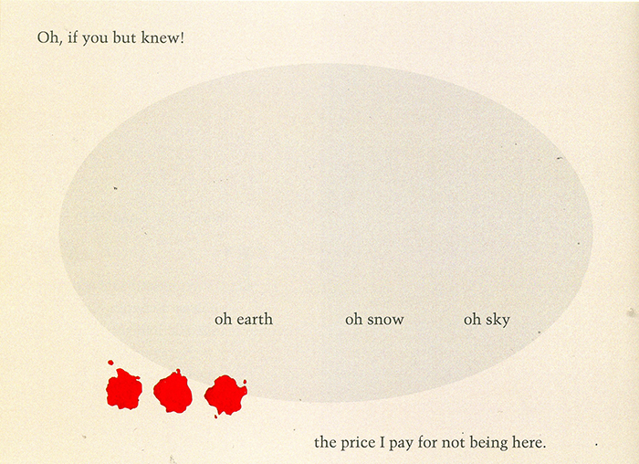 Este ejercicio dialéctico no sólo se realiza entre la imagen y texto original, se le suma un tercer factor: la traducción. El libro es bilingüe y de hecho comienza, no gratuitamente, con la versión del primer poema en inglés. Más adelante, se irá alternando el orden entre las pinturas, el texto original y las traducciones. Lo interesante de la dinámica que forman estos tres elementos es que juegan entre sí. Uno de los ejemplos más claros se encuentra en el poema “Hora de enviar una postal”, en donde el texto está insertado en la pintura. La versión en inglés tiene una distribución en imágenes casi completamente distintas a la del texto original, con excepción de tres puntos rojos, dispuestos en forma de espejo, que comunican ambas pinturas.
