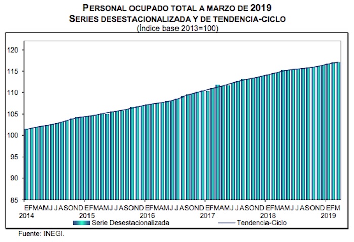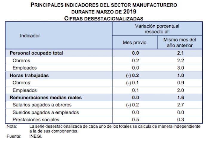Ciudad de México, 17 de mayo (Economía Hoy/SinEmbargo).- El personal ocupado total del sector manufacturero en México se mantuvo sin cambio durante marzo de 2019 con respecto a su nivel de febrero, pero a tasa anual, registró un aumento de 2.1 por ciento.
