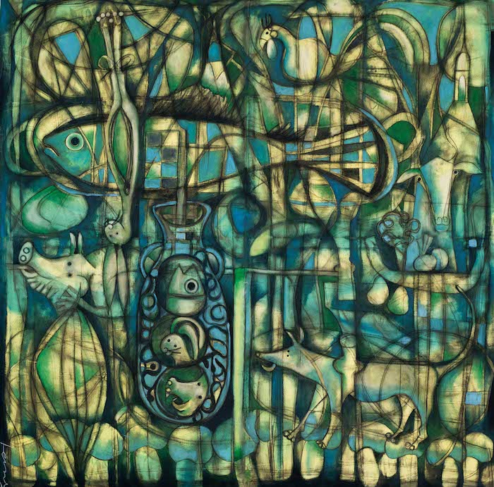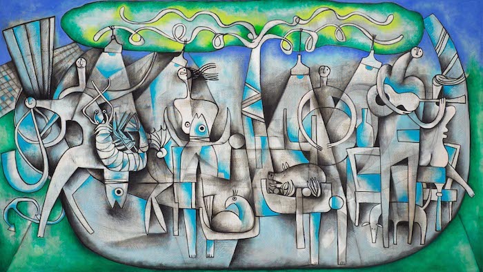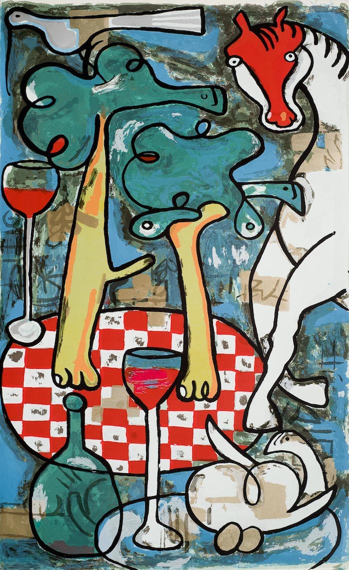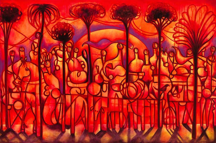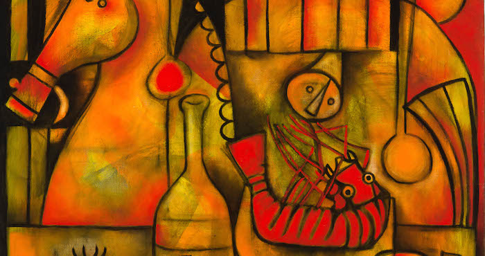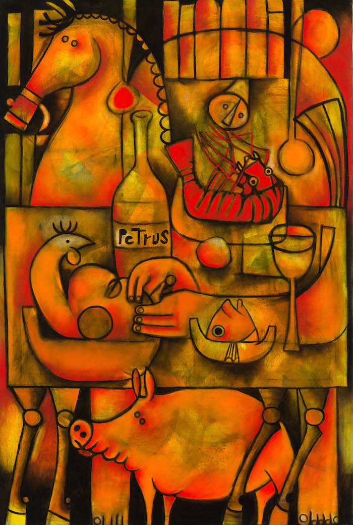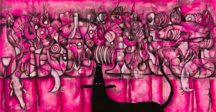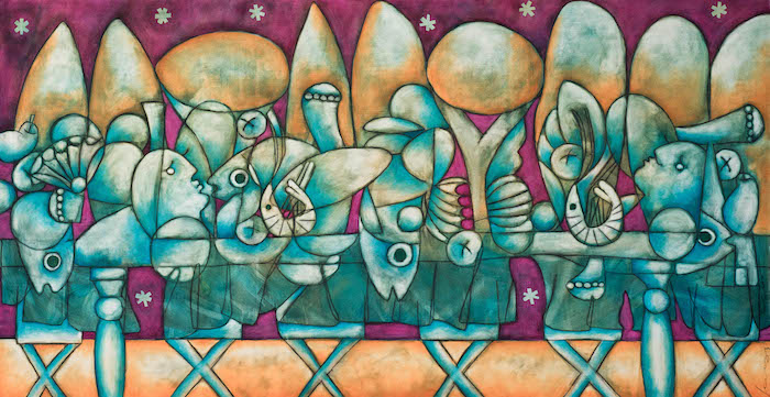 En otras palabras: resulta peculiar que el referente popular del ágape, de la gula de comida y bebida, descanse su barroquismo en una suerte de entramado encriptado pero apolíneo, y se presente a manera de un mosaico nutrido en capas y decoraciones que no termina por despistar al espectador, sino que lo interpela a que siga en el descubrimiento de sus elementos, el reto de apreciar los figurantes de las estampas, más o menos camuflados en el jardín de los trazos, en los andamiajes compositivos del cuadro. ¿La resultante? Un elenco de seres, objetos y complejos escenarios para que el espectador ponga en relación ya sea en concordancia al mito que se presente, o bien según el universo en que quiera disponerlos el observador participante y permita la obra.