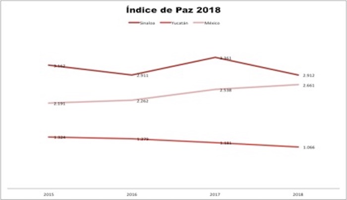 Sin embargo, si usted revisa la gráfica anexa, verá que desde 2015 no hemos logrado grandes mejoras en nuestros niveles de paz absolutos. Estamos todavía muy lejos de Yucatán, el estado más pacífico del país, y nuestra mejora se explica más porque durante 2018 la paz en México se redujo en general en 4.9 por ciento. Es decir, la situación de paz en Sinaloa no se deteriora, mientras que en el resto del país sí.